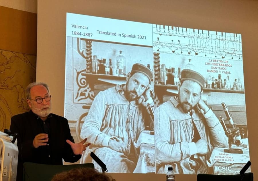 El día 5 de abril, a las 12:00h, en el Salón de Actos del CIB Margarita Salas, Nicolás Cuenca y Pedro de la Villa, autores de la traducción al castellano del libro «La retina de los vertebrados» de D. Santiago Ramón y Cajal, presentarán el libro, que fue editado por CSIC en 2021, y también inaugurarán la exposición sobre Ramón y Cajal y la retina, realizando visita comentada a la exposición.
