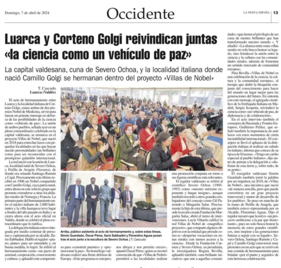 La localidad natal del médico Santiago Ramón y Cajal, Petilla de Aragón, está hermanada con Valdés-Luarca, localidad natal de Severo Ochoa. Ambas localidades han formado la red Villas de Nobel, una iniciativa asturiana a la que recientemente se ha sumado la italiana Corteno Golgi (Lombardía), localidad natal de Camillo Golgi. En marzo de 2023, Petilla de Aragón y Corteno Golgi firmaron el hermanamiento en un acto donde también se nombró a Ramón y Cajal, hijo predilecto de la localidad navarra. Los italianos hicieron lo propio con los asturianos en octubre pasado.