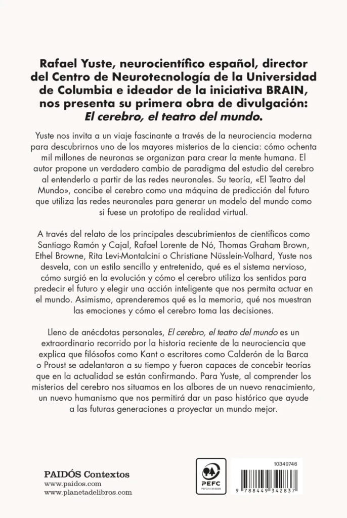Yuste nos invita a un viaje fascinante a través de la neurociencia moderna para descubrirnos uno de los mayores misterios de la ciencia: cómo ochenta mil millones de neuronas se organizan para crear la mente humana. El autor propone un verdadero cambio de paradigma del estudio del cerebro al entenderlo a partir de las redes neuronales. Su teoría, «El Teatro del Mundo», concibe el cerebro como una máquina de predicción del futuro que utiliza las redes neuronales para generar un modelo del mundo como si fuese un prototipo de realidad virtual.