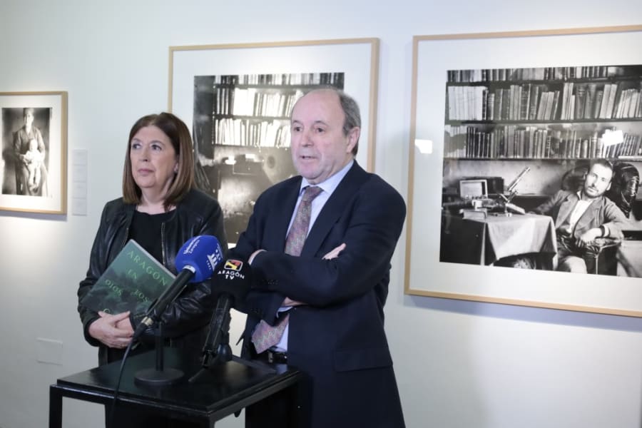 El rector, José Antonio Mayoral; la vicerrectora de Cultura y Proyección Social, Yolanda Polo; el comisario de la exposición, José María Serrano Sanz; el director general de la Fundación Ibercaja**, José Luis Rodrigo Escrig, y el director general de Cultura del Gobierno de Aragón, Pedro Olloqui,** han inaugurado esta mañana la muestra en las Salas Goya y Saura del Paraninfo.