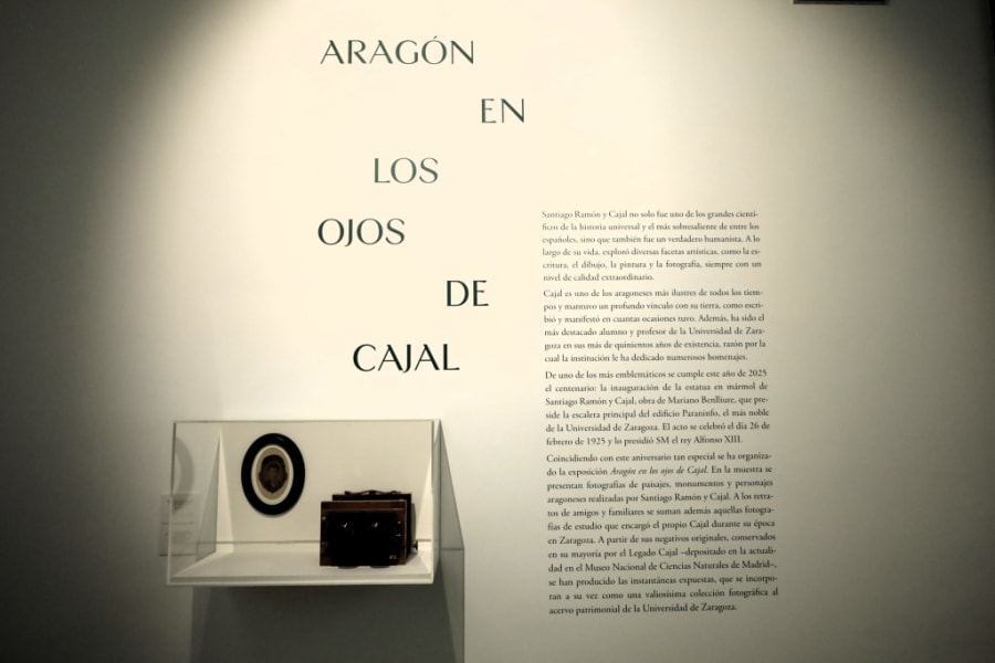 En esta ocasión se ha organizado una nueva exposición titulada ***Aragón en los ojos de Cajal, ***que se celebrará en el edificio Paraninfo entre febrero y junio de 2025. Se trata de una muestra en la que se presentan dibujos, pinturas y fotografías realizadas por Santiago Ramón y Cajal, que recogen paisajes o monumentos aragoneses, así como fotografías de escenas o personas cercanas que fueron hechas en Aragón. Con ella se pretende dar a conocer algunas de las otras facetas de Cajal más allá de la científica y, al tiempo, mostrar el compromiso que en todo momento mantuvo con su tierra.