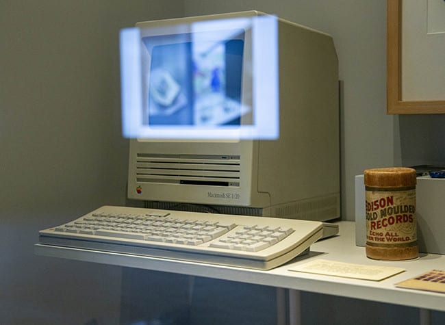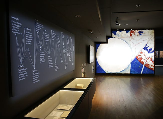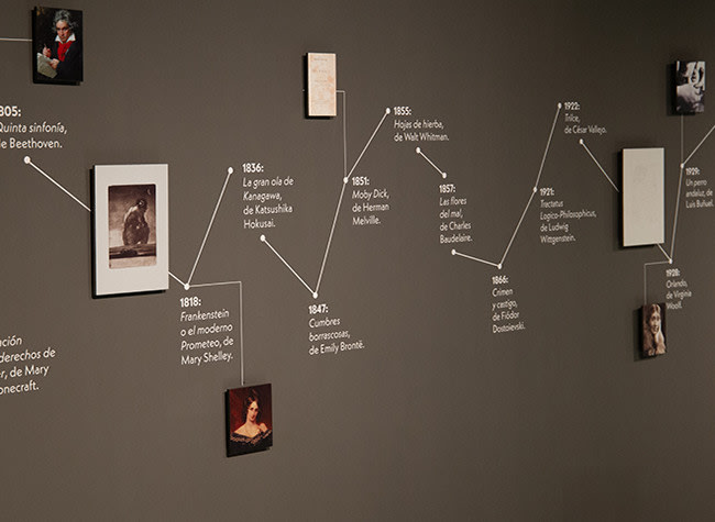 Junto a las citas, las vitrinas y las pantallas, varias cronologías. Del primer alfabeto al nacimiento de Whatsapp. Las obras maestras de la humanidad. De las pinturas rupestres al archivo virtual que es La Nube. Todas ellas acaban en el año 2050, planteando incógnitas que nos proyectan hacia el futuro. “¿Cómo serán nuestra comunicación y nuestras bibliotecas?”. “¿Cómo serán las obras maestras? ¿Qué maravillas artísticas nos aguardan en el futuro?”. “¿Qué tecnologías de la memoria, la producción y la circulación de textos, imágenes o experiencias condicionarán nuestras vidas? ¿Somos ni siquiera capaces de imaginarlas?”.