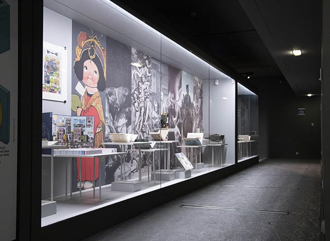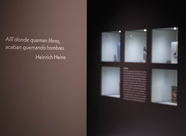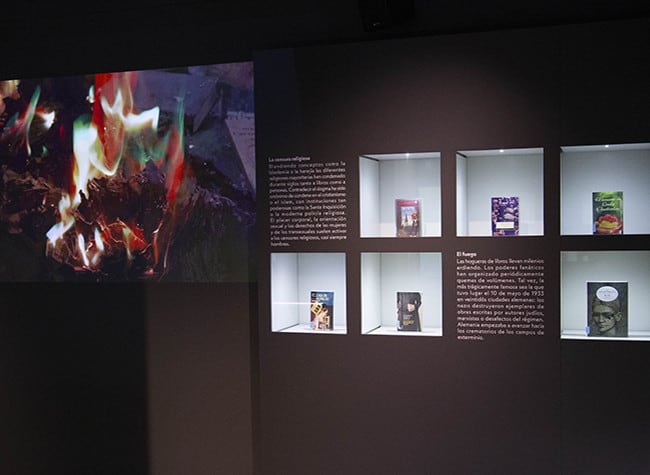 Los discursos y formatos que se complementan y crean conexiones culturales son el leitmotiv de todo el espacio: obras en papel, pantallas, murales, animaciones interactivas, vídeos. Letras detenidas e imágenes en movimiento continuo; un libro que arde en sentido literal y figurado (obra-performance ‘Fahrenheit 451’ de Joan Fontcuberta) y obras en algún momento censuradas merecedoras de ser conservadas y expuestas en la parte ‘infierno’ de este museo-exposición. Del ‘Lazarillo de Tormes’ a ‘El principito’. De ‘Lolita’ a ‘Persépolis’. De ‘La Celestina’ a ‘Los versos satánicos’.