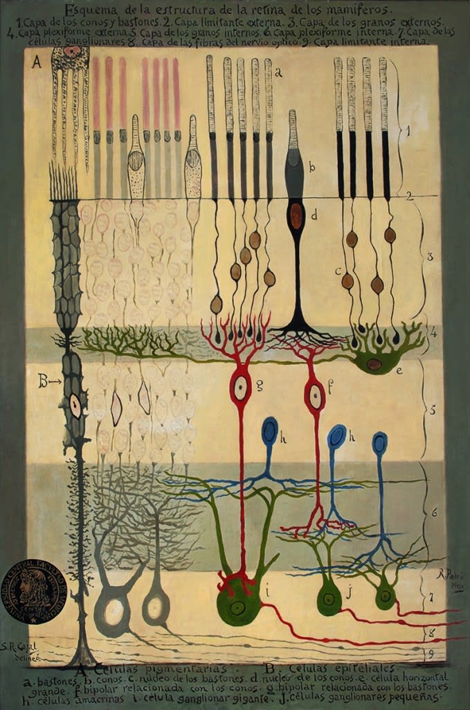 Santiago Ramón y Cajal publicó los primeros estudios de la retina en 1888, siendo catedrático de Histología en la Facultad de Medicina de la Universidad de Barcelona. En estos trabajos es donde Cajal demuestra que las neuronas son células independientes, concepto que constituye la base de la teoría neuronal.