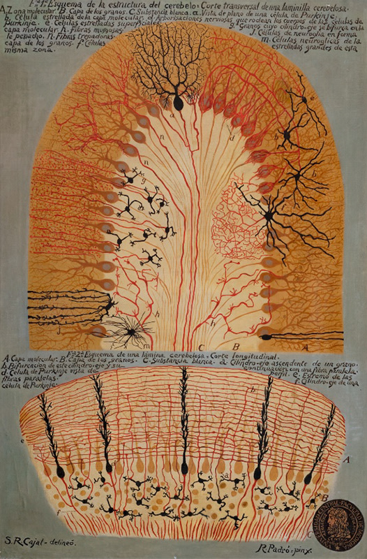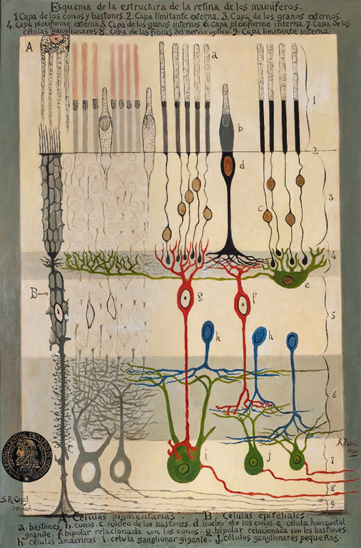 Currently, six of these panels are preserved at the Universidad Complutense, representing various histological structures of the nervous system: the cerebral cortex, the connections of the spinal cord, the structure of the cerebellar cortex (figure 1), the structure of the retina (figure 2), the diagram of the central olfactory apparatus, and the cochlear duct (organ of Corti). Cajal’s studies of the cerebellar cortex and the retina were decisive in demonstrating that neurons are independent cells that contact one another (synapses) — the principles upon which the neuron doctrine is founded. The panel of the cerebellar cortex appears in the background of the portrait painted by the Valencian artist Joaquín Sorolla. In this panel, Cajal schematically shows the arrangement of the different types of neurons and nerve fibers in this structure, compiling in a single drawing the observations obtained through two of the methods most used by Cajal: the Golgi method and his own reduced silver nitrate method.